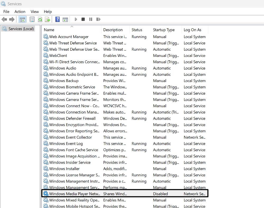 6. Desative o serviço de compartilhamento de rede do Windows Media Player