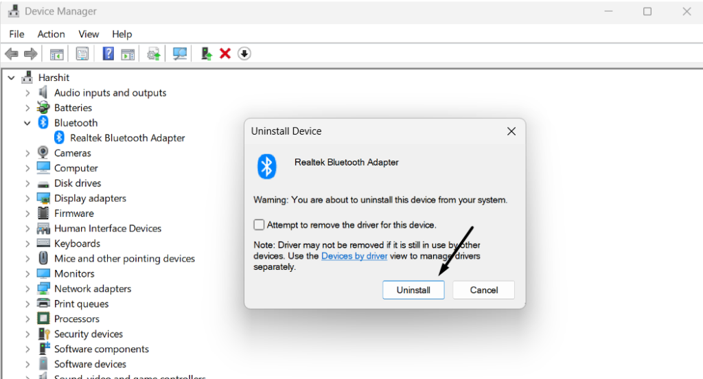 3.No novo prompt, escolhaDesinstalarpara remover o adaptador do seu PC com Windows 11.