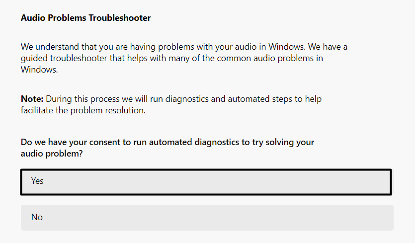 4.NoObtenha ajudajanela, escolha oSimopção para permitir que o PC inicie uma solução automática de problemas de áudio.