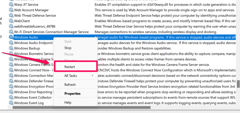 2.NoServiçosjanela, encontreServiço de áudio do Windows, clique com o botão direito e selecione oReiniciaropção dele.