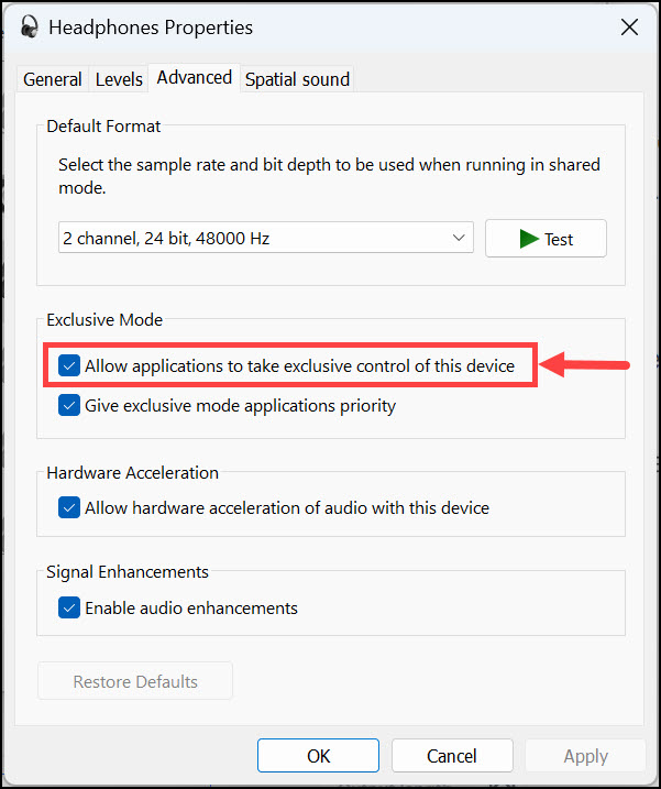 Pode ser que o Modo Exclusivo esteja habilitado para o seu microfone, e é por isso que outros aplicativos não conseguem usá-lo para gravar áudio. Então, você precisa desativá-lo e verificar se o microfone funciona. Você pode aprender adesativar o modo exclusivoseguindo as etapas abaixo:
