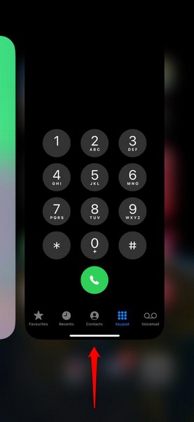 1.Com o aplicativo Phone aberto no seu iPhone,deslize de baixo para cimada tela paraabra o painel multitarefa.