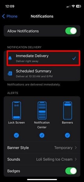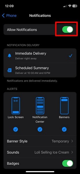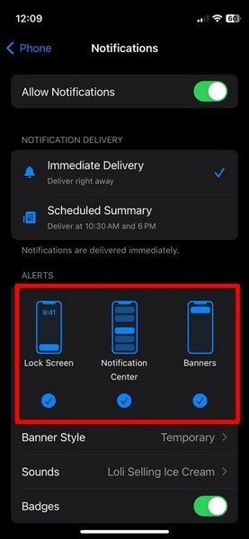 7.Você também pode passar por outras configurações comoEstilo de banner,Sons, eEmblemaspara personalizar ainda mais as configurações de notificação do aplicativo Telefone no seu iPhone.