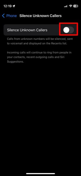 Outro recurso que pode fazer com que o aplicativo Telefone não funcione no iPhone é o recurso Silenciar chamadores desconhecidos. O recurso foi projetado para silenciar automaticamente chamadas de números desconhecidos. Caso esteja habilitado em seu aparelho, você perderá ligações de qualquer número que não esteja em sua lista de contatos.