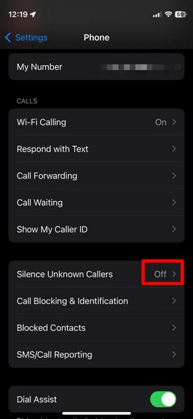 5. Certifique-se de que Silenciar chamadores desconhecidos esteja desativado