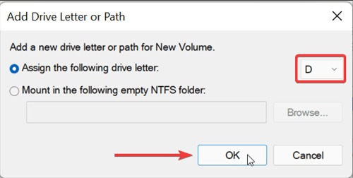 3.NoAdicionar letra ou caminho de unidadejanela, escolhaUMno menu suspenso e clique emOK.