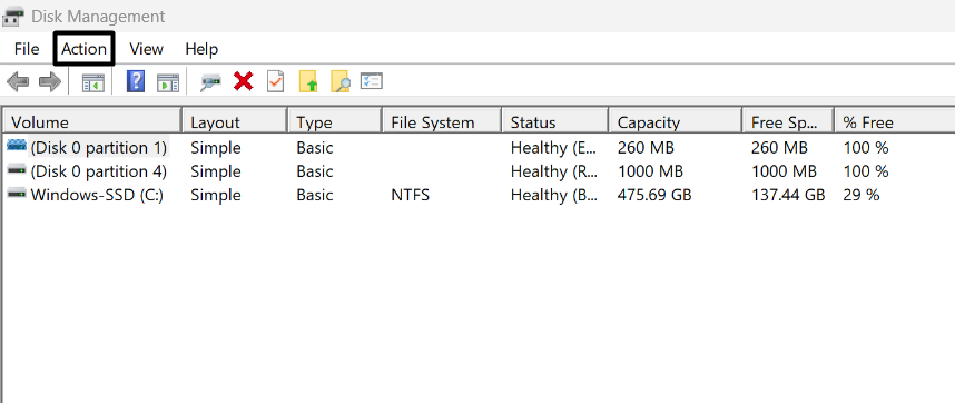 3.NoGerenciamento de discojanela, escolha oAçãoopção no menu superior para obter um menu.
