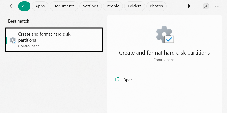 2.Nos resultados da pesquisa emMelhor correspondência, escolherCrie e formate partições do disco rígido.