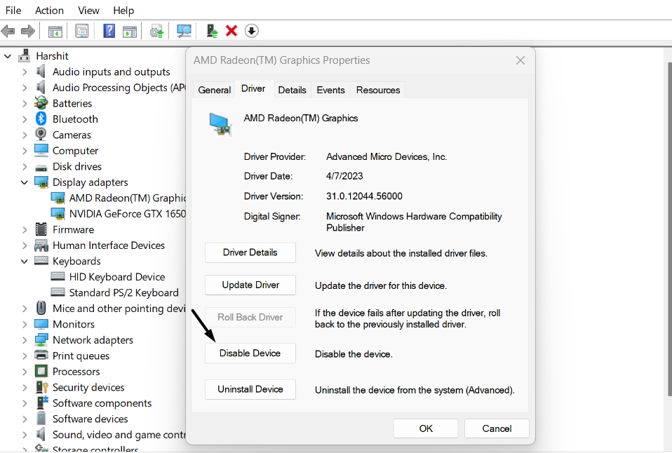 4.NoMotoristaguia, clique noDesativar dispositivobotão e depois cliqueAtivar dispositivopara reativá-lo.