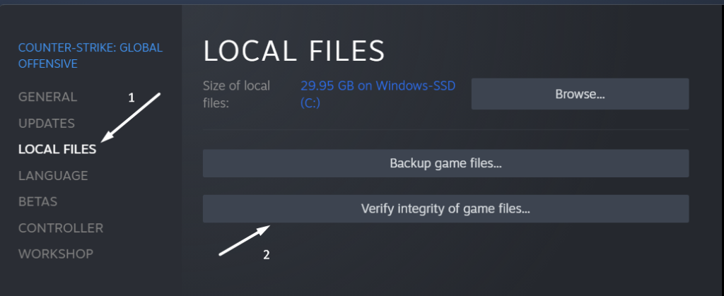 3.Agora, selecione oARQUIVOS LOCAISopção na barra lateral esquerda e clique no botãoVerifique a integridade dos arquivos do jogo…opção.