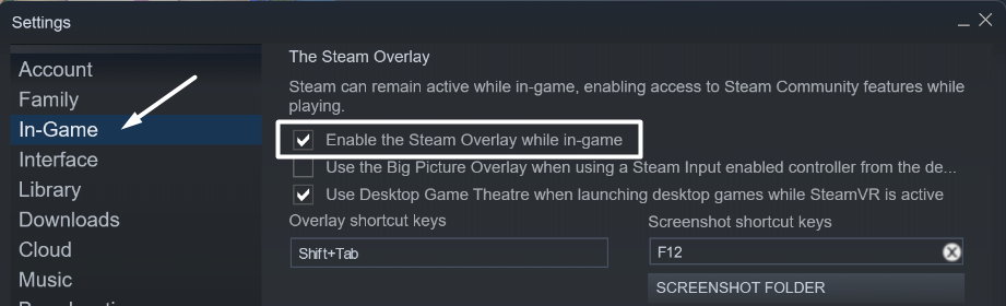 3.Por último, certifique-se de que a caixa de seleção ao lado doSobreposição do Steam durante o jogoopção está marcada noA sobreposição do Steamseção.