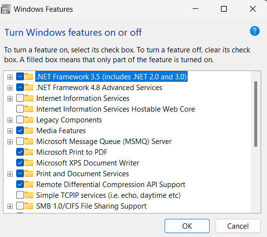 O Windows começará a instalar o .NET Framework usando os recursos do Windows. Esse processo pode levar algum tempo e você pode ser solicitado a reiniciar o computador para concluir a instalação.