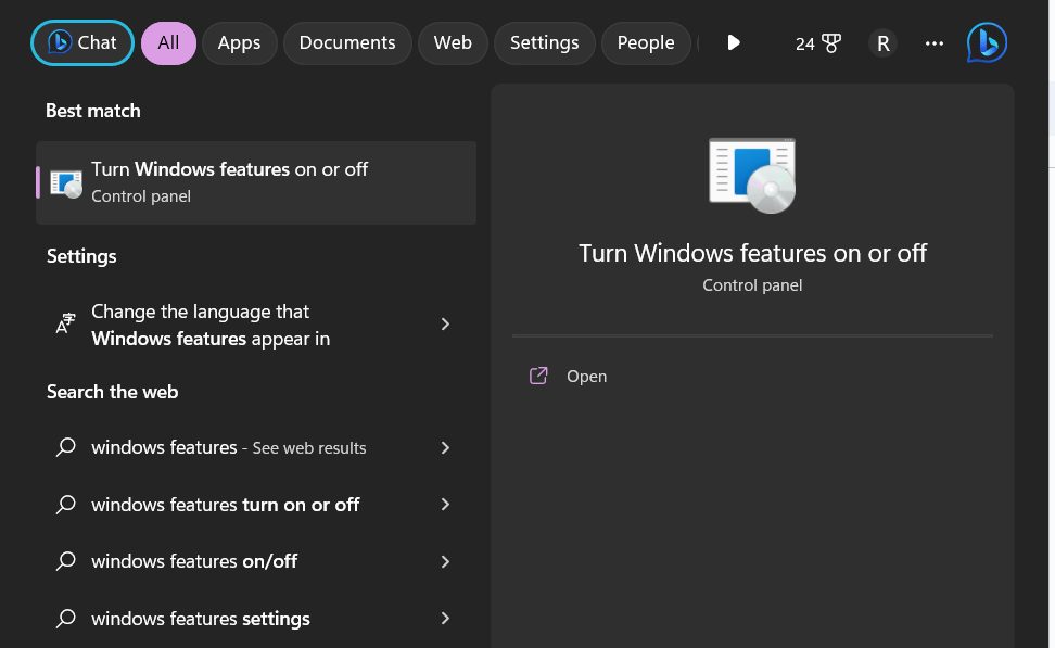 Passo 2: Digite “Recursos do Windows” na barra de pesquisa ou comece a digitar diretamente no menu Iniciar. Nos resultados da pesquisa, clique na opção “Ativar ou desativar recursos do Windows”.