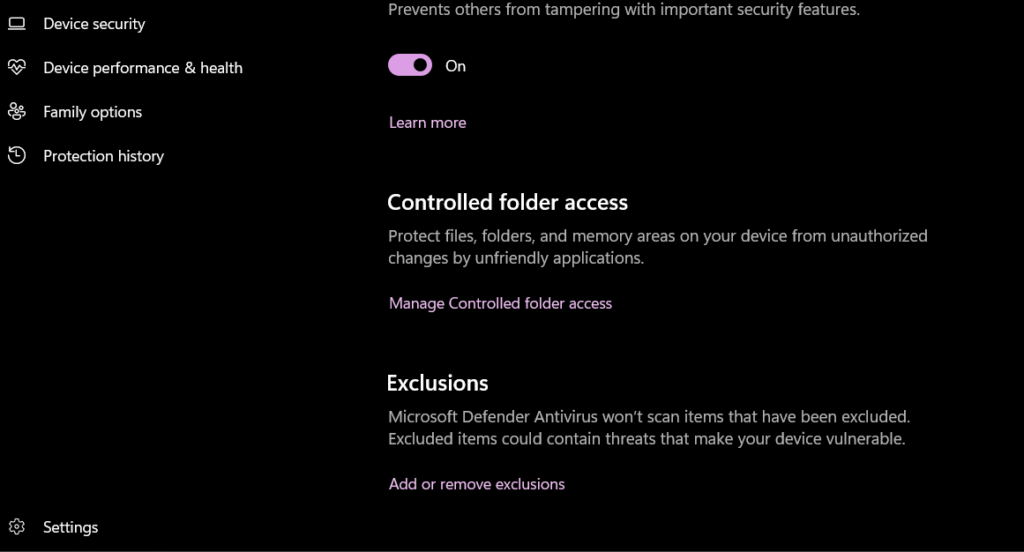 - Role para baixo para encontrar “Acesso controlado a pastas” e desative-o.