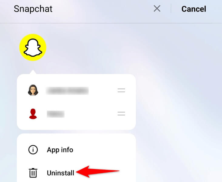 - Toque e segureSnapchatna gaveta do seu aplicativo e selecioneDesinstalar.