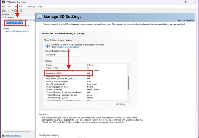 3.Sob oGuia Gerenciar configurações 3Dna barra de navegação esquerda, localize oOpção de modo de baixa latênciadentro doCaixa de configuraçõesno painel direito.