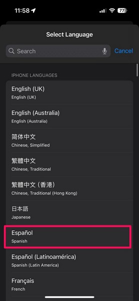 5.Agora, percorra os idiomas disponíveis eselecione qualquer um dos idiomas suportados pelo Visual Look Up.