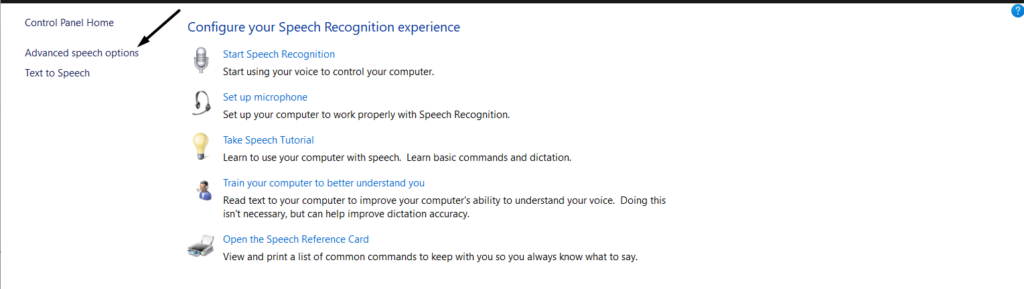 2.Clique emReconhecimento de falae selecioneOpções avançadas de falano painel do lado esquerdo.