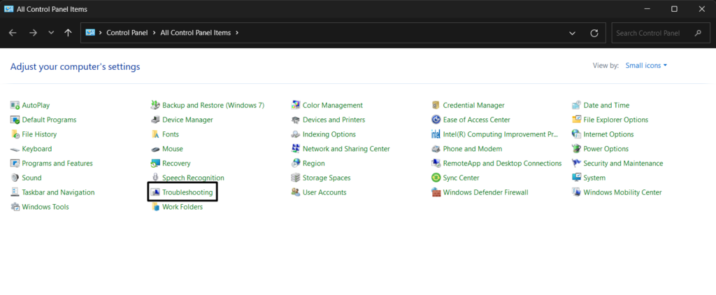 2.Defina oVer por:opção no canto superior direito da janela paraÍcones pequenose clique emSolução de problemas.