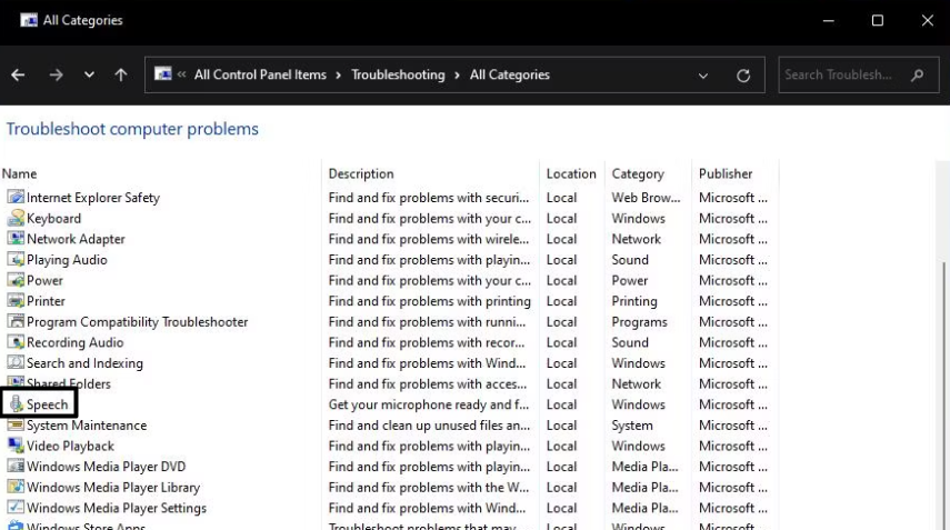 3.Clique noVer tudoopção no lado esquerdo doSolução de problemasjanela e clique emDiscurso.