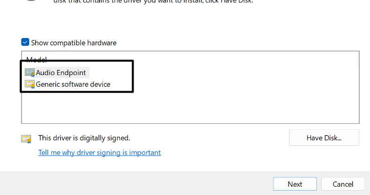 4.Selecione qualquer outro driver de microfone dos drivers listados e clique emPróximopara substituí-lo pelo existente.