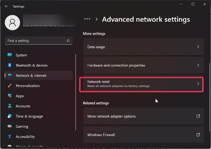 2.Expanda oConfigurações avançadas de redeseção e clique emRedefinição de redesobMais configurações.
