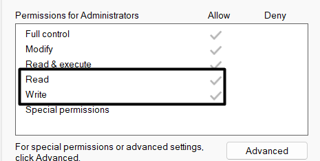 3.Certifique-se de que haja uma marca ao ladoLereEscrevernoPermitircoluna sob oPermissões para (nome da sua conta)seção.