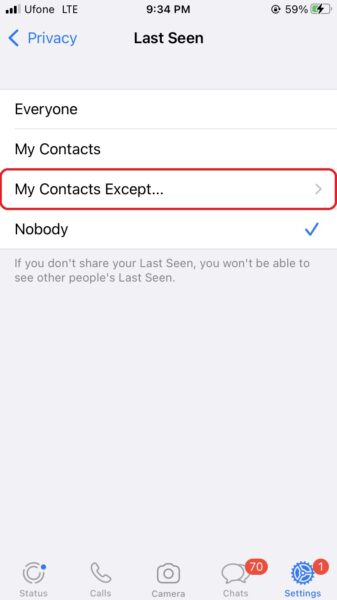- Por fim, selecione o contato do qual deseja ocultar seu status de Visto pela última vez e toque emFeitopara finalizar sua lista.