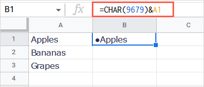 Se você deseja simplesmente o ponto preto padrão para o marcador, o número é 9679. Em seguida, inclua o item da lista na fórmula CHAR entre aspas ou usando uma referência de célula. Vejamos alguns exemplos.