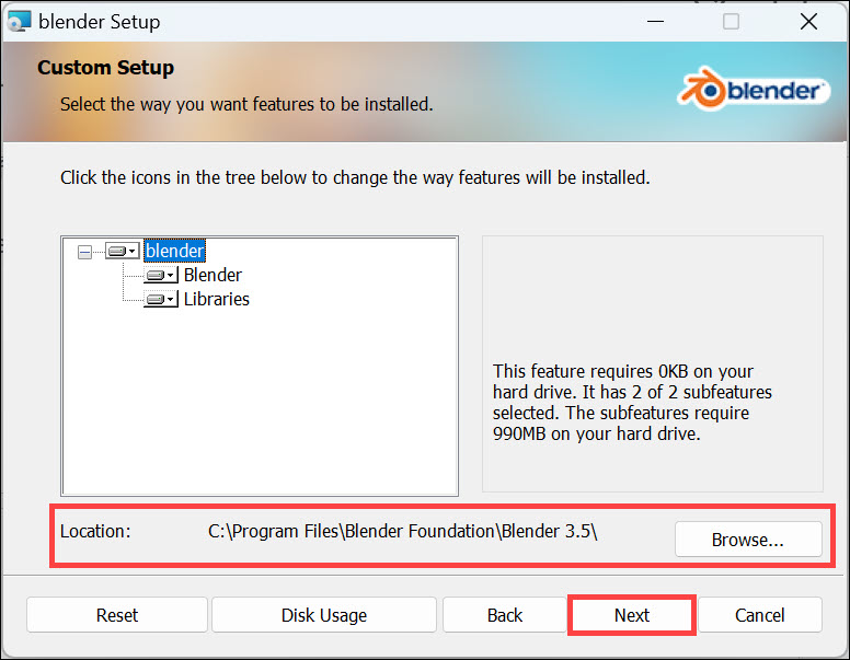 6.A seguir, você será solicitado a escolher a pasta de destino onde deseja instalar o Blender. Se você tiver um local preferido, selecione-o. Caso contrário, você pode manter o local padrão. Clique noPróximobotão para iniciar o processo de instalação.