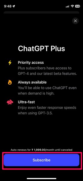Até o surgimento do aplicativo ChatGPT para iOS, os usuários podiam assinar o ChatGPT Plus por meio do cliente web ChatGPT ou da versão PWA no Windows. No entanto, agora você pode seguir as etapas a seguir para assinar o ChatGPT Plus diretamente do seu iPhone por meio do aplicativo ChatGPT para iOS: