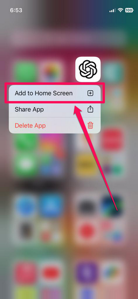 9.Ele também pode ser adicionado automaticamente à tela inicial do seu dispositivo iOS se você tiver a configuração relevante ativada. Se não for adicionado automaticamente, você podetoque e segure o aplicativo ChatGPTna página da App Library e toque noAdicionar à tela inicialbotão no menu de contexto.