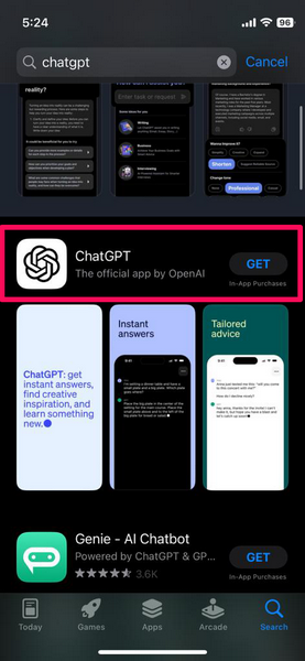 4.Nos resultados da pesquisa, toque noChatGPT (o aplicativo oficial da OpenAI)listagem. Se você está lendo isso no seu iPhone, você também podetoque neste linkpara abrir diretamente a página de download do ChatGPT na App Store do seu dispositivo.