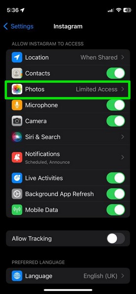 3.Em seguida, toque noFotosopção sob oPermitir acesso ao Instagram paraseção. Deve observar a configuração atual de acesso ao Fotos do aplicativo no iPhone.
