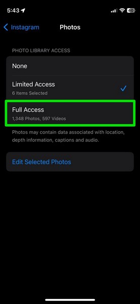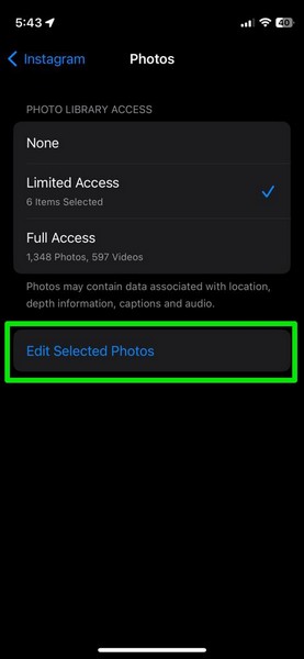 Agora, o Instagram ou o aplicativo de sua seleção terá acesso apenas às imagens e vídeos do aplicativo Fotos que você selecionou no seu iPhone. O acesso a outras imagens e vídeos no aplicativo Fotos será cancelado para o aplicativo.