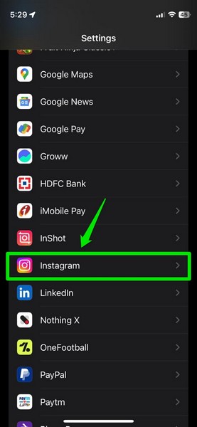 2.Role para baixo elocalize o aplicativopara o qual você deseja limitar o acesso às fotos na lista e toque nele para abrir a página de configurações do aplicativo. Nesse caso, vamos pelo Instagram, conforme mencionado.