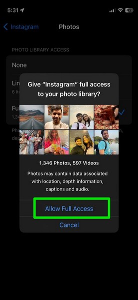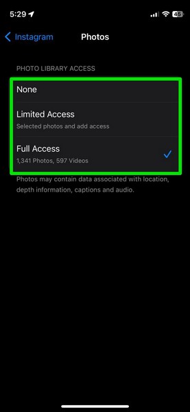 5.Selecionando oNenhumopção revogará o acesso a toda a biblioteca de mídia do Instagram no iPhone.