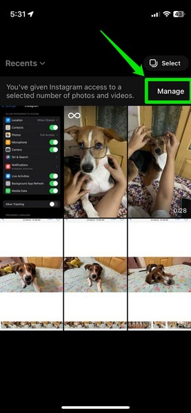 Nesta tela, você pode tocar noGerenciarbotão paraadicione mais arquivos de mídiaà lista de imagens e vídeos que o Instagram pode acessar oualterar a configuração de acesso às fotos do Instagrampara fornecer acesso total ao aplicativo, que discutimos abaixo.