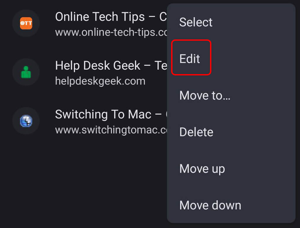 - No gerenciador de favoritos, selecione oMaisícone ao lado do favorito que você deseja editar.