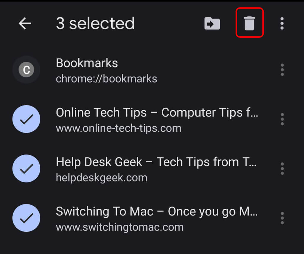 Em um dispositivo Android, toque emMais>Favoritos. Em seguida, à direita do favorito que deseja excluir, toque emMais>Excluir. Para excluir vários favoritos, mantenha pressionado cada favorito que deseja excluir e toque no botãoExcluir(lata de lixo) ícone.