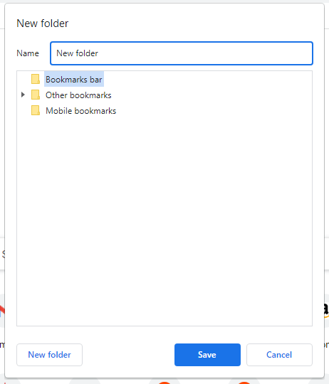 Você também pode clicar com o botão direito na barra de favoritos do Chrome em um computador e selecionarAdicionar pasta. Nomeie a nova pasta e selecioneSalvar.