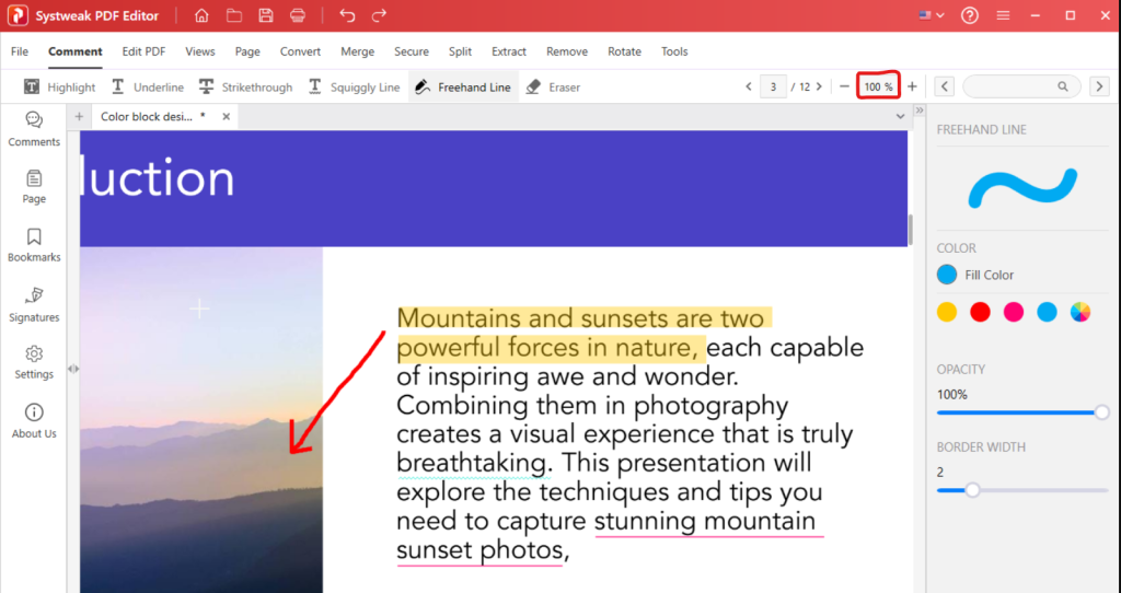 Na parte superior do Systweak PDF Editor, você pode encontrar o recurso de aumentar e diminuir o zoom que pode ser útil em vários casos enquanto você navega em seu PDF –