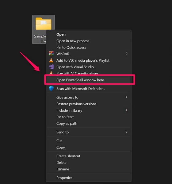 3.Alternativamente, você podelocalize a pasta com o arquivo DLLque você está tentando registrar, segure o botão Shift, clique com o botão direito nele e selecione oAbra a janela Command/Powershell aquiopção no menu de contexto.
