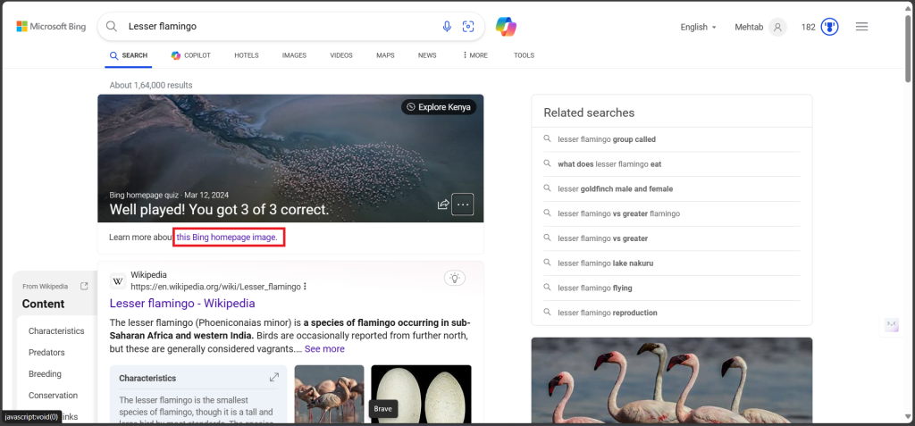 Dica:Se quiser saber mais sobre o quiz que acabou de responder, clique em “Saiba mais sobreesta imagem da página inicial do Bing.”
