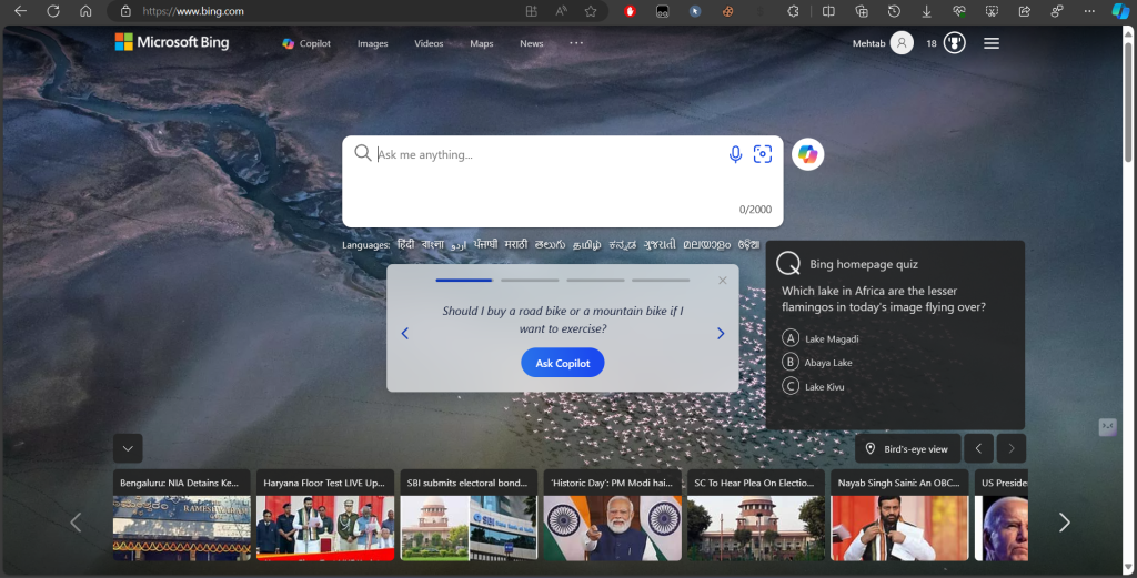 Bing é o segundo mecanismo de busca mais popular, desenvolvido pela Microsoft em 2009. O mecanismo de busca já percorreu um longo caminho com vários recursos como Ask Copilot, suporte para vários idiomas, pesquisa de imagens e muito mais.