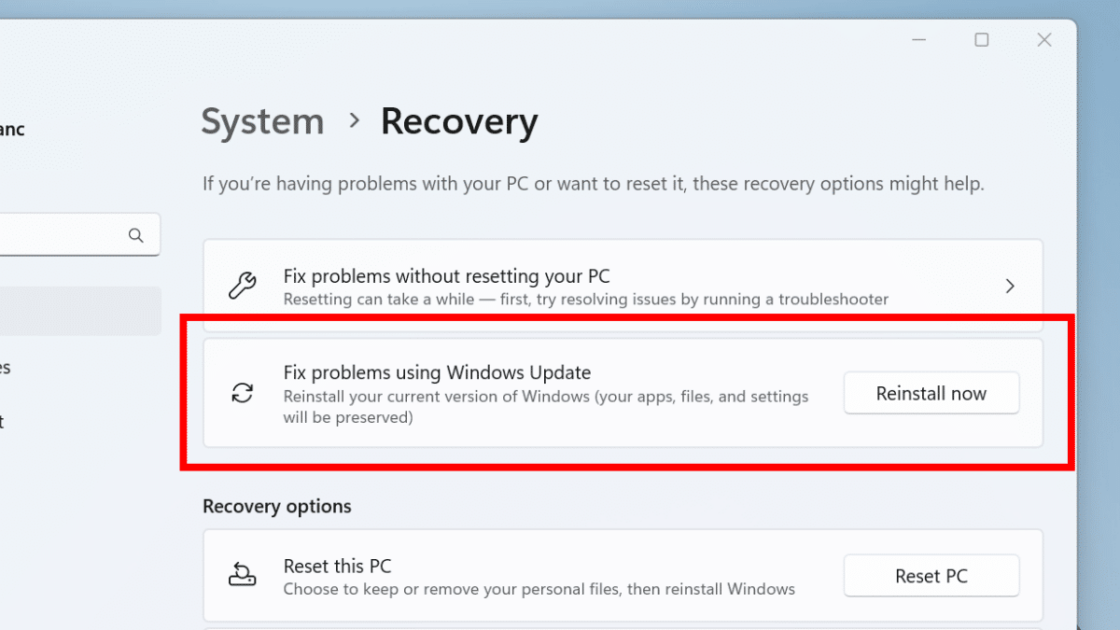 - Navegue atéConfigurações>Sistema>Recuperaçãoe em “Opções de recuperação”, clique no botão “Reinstale agora”Para o“Corrija problemas usando o Windows Update" contexto.