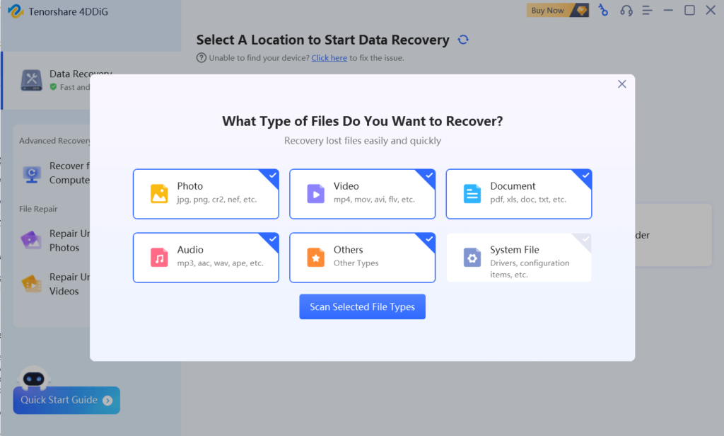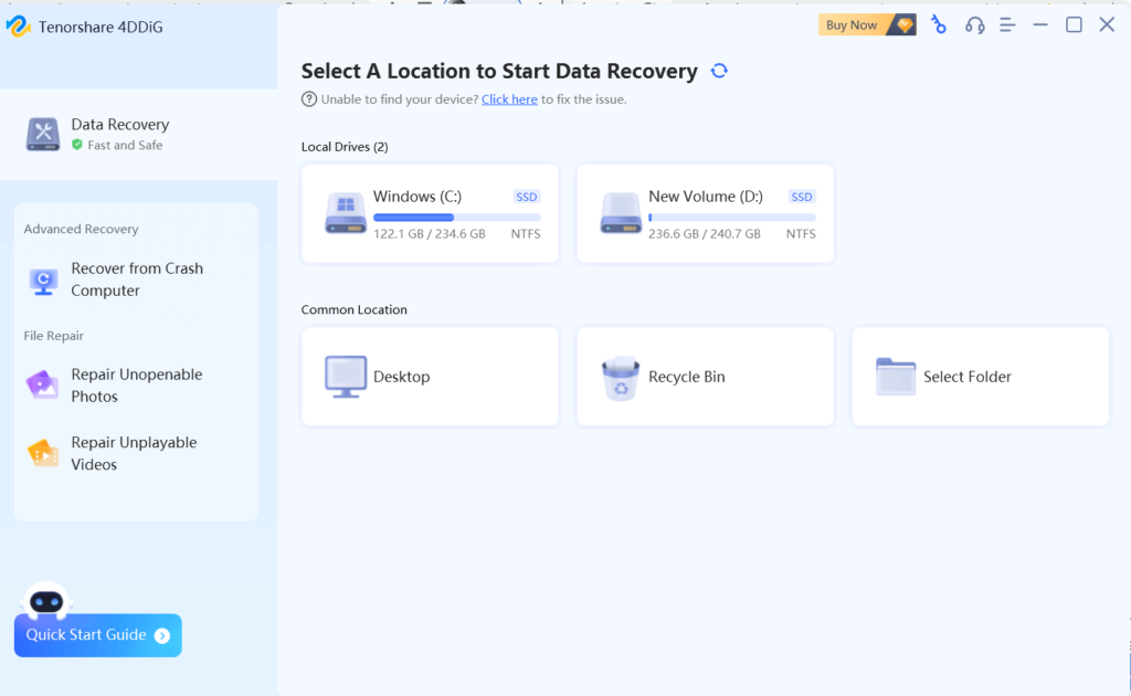 Existem muitosferramentas de recuperação de dadosque podem ajudá-lo a recuperar dados perdidos acidentalmente em vários formatos de arquivo. Tenorshare 4DDiG, por exemplo, é um utilitário de recuperação de dados que pode ajudá-lo a recuperar arquivos do sistema, como drivers, itens de configuração, etc.