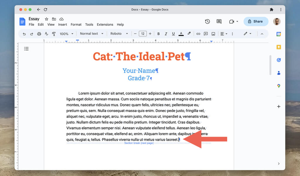 - Posicione o cursor acima da linha horizontal da quebra de seção e pressioneExcluir(Windows),Fn+Excluir(Mac) ouTodos+Retrocesso(Chromebook) para removê-lo.