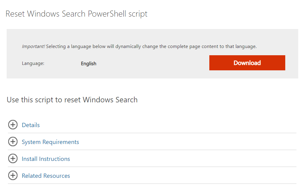 Etapa 1:Baixe oRedefinirWindowsSearchBox.ps1Script do PowerShell doPágina de download da Microsoft.