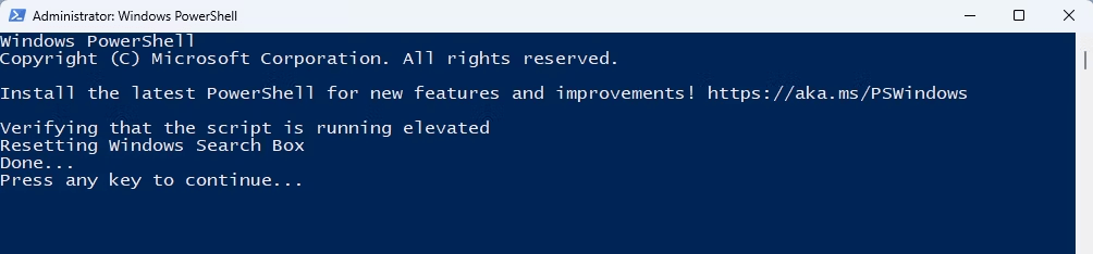 Observação:O script redefine as configurações de pesquisa do Windows após uma execução bem-sucedida.